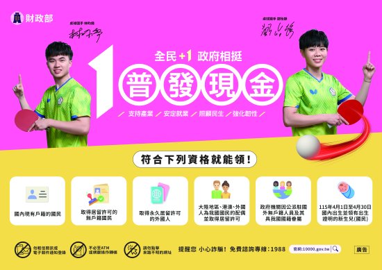 | 三、 | 考量部分民眾不易取得網路資訊,財政部製作紙本宣導海報,提供民眾獲取普發現金政策訊息另一種管道,請協助張貼,或轉送所轄單位配合宣導,以利民眾即時獲取相關政策訊息。 |
